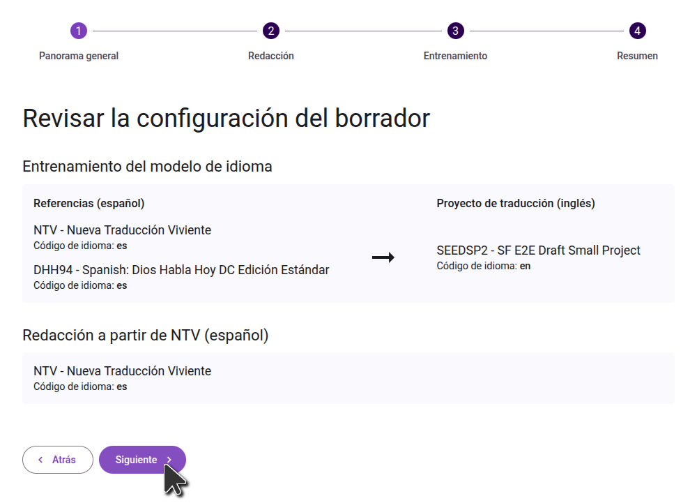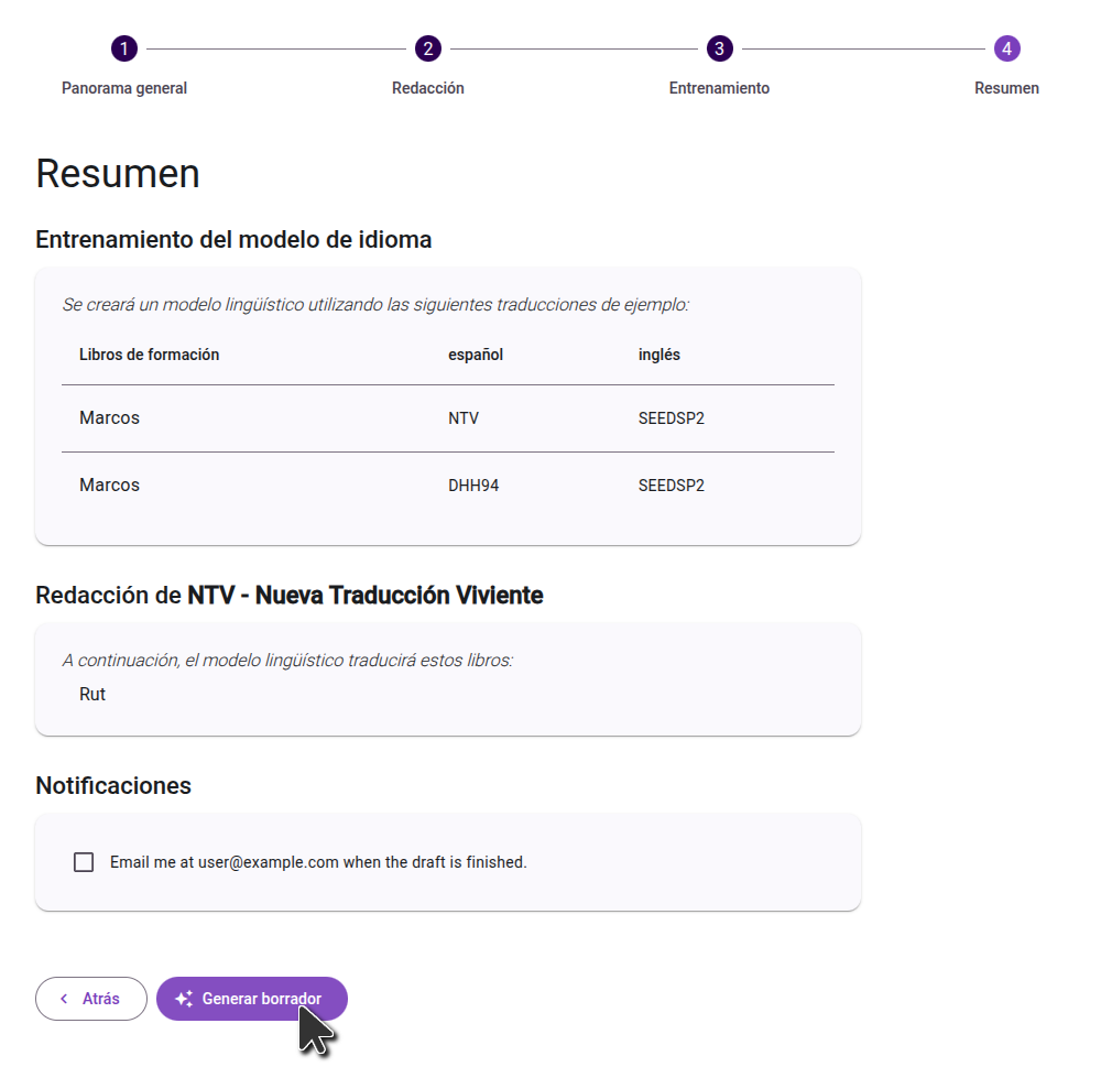 En el último paso, revise los libros que seleccionó para entrenar el modelo y los que seleccionó para el borrador. Si necesita realizar algún cambio, puede volver a los pasos anteriores. Una vez que esté satisfecho con sus selecciones, haga clic en el botón "Generar borrador" para iniciar el proceso.