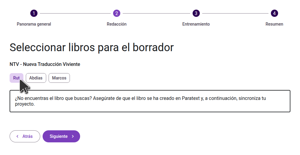 En el segundo paso, seleccione los libros que desea traducir. Si el libro que desea redactar no existe en su proyecto Paratext, tendrá que crear primero el libro en Paratext. En general, le sugerimos que redacte un libro a la vez, aunque si está redactando libros más pequeños, puede que le convenga redactar varios a la vez.