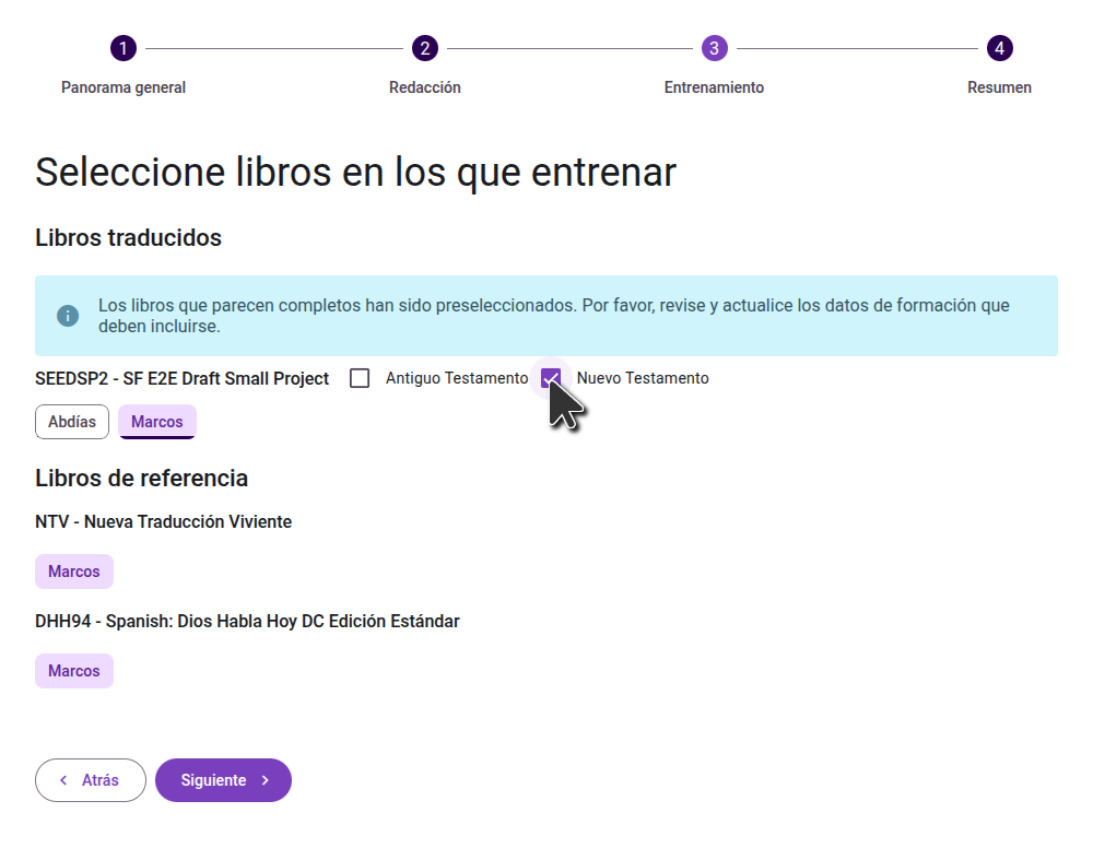 En el siguiente paso, seleccione los libros a utilizar para formar el modelo de idioma, tanto en su proyecto principal como en los proyectos de referencia. Elija todos los libros de su proyecto que hayan sido revisados adecuadamente. Aunque no es necesario que estén revisados por consultores, deben ser traducciones precisas del libro de origen.