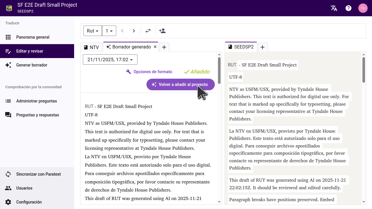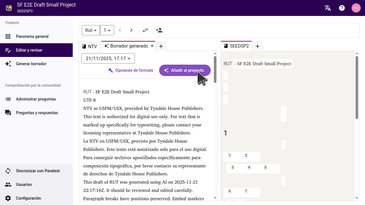 Una vez que haya importado el borrador a un proyecto, sincronice el proyecto en Scripture Forge y haga un enviar/recibir en Paratext para ver los cambios.