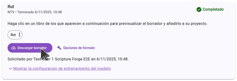 Cuando termine su borrador, Scripture Forge le indicará que está listo y listará los libros que fueron borrados. Los borradores generados no se importan automáticamente a su proyecto. Puedes previsualizar o importar borradores desde la página Generar borrador.