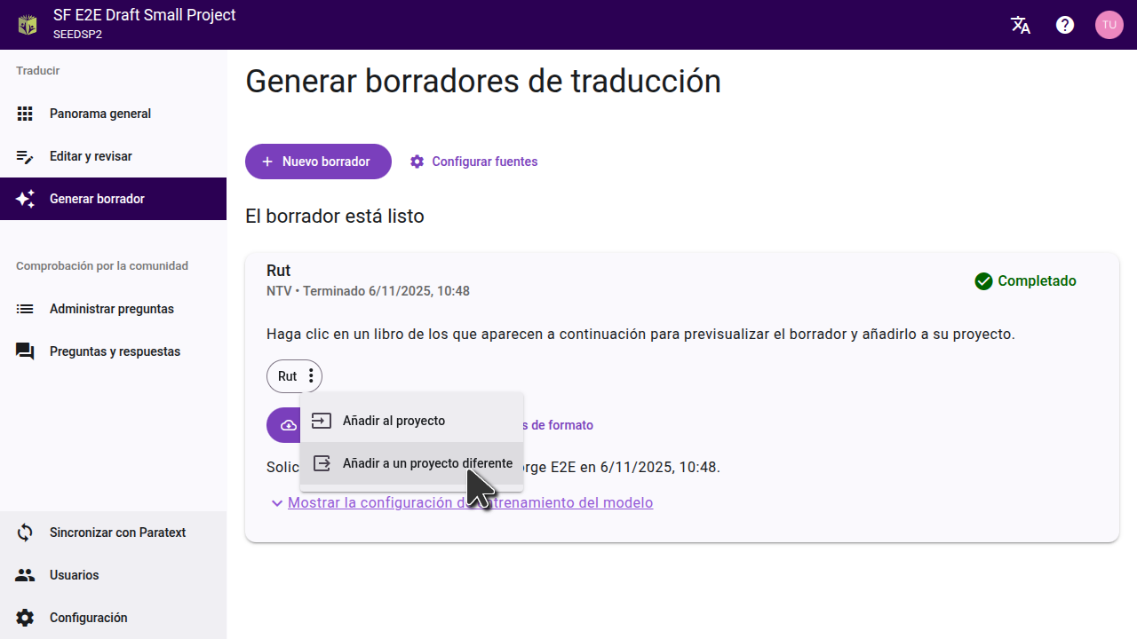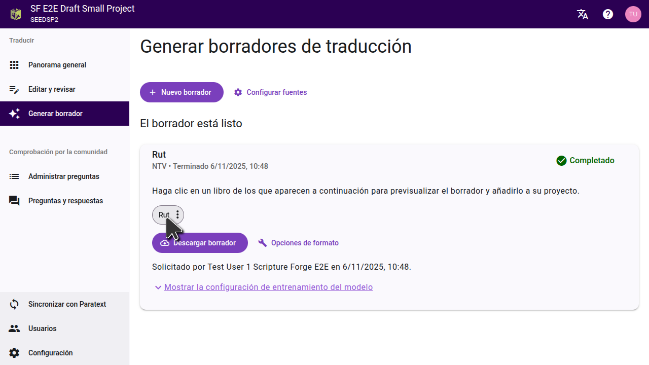 Si prefiere no importar el borrador directamente a su proyecto, también puede descargarlo como archivos USFM. En la página "Generar borrador", haga clic en "Descargar borrador" y extraiga los archivos en su computadora. A continuación, puede importar estos archivos a un proyecto en Paratext.