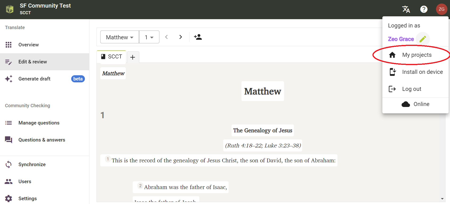 Setelah proyek Paratext terhubung ke Scripture Forge, setiap pengguna yang menjadi anggota proyek di Paratext (di bawah Izin Pengguna) akan dapat membuka proyek di Scripture Forge.