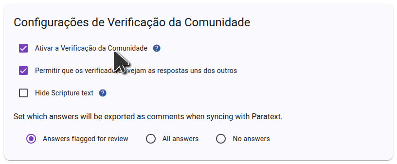 To use Scripture Forge community checking, you need to first log in to Scripture Forge using your Paratext credentials and connect your project. Once your project is connected, navigate to Settings and scroll down to the Community Checking section. Make sure the "Enable Community Checking" checkbox is ticked as shown in the screenshot below.