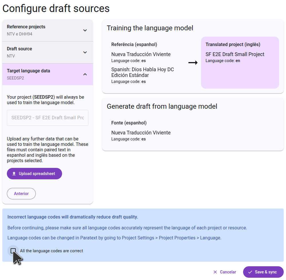 On the right side, you will see a diagram of how the projects you selected will be used to generate the draft. In the first step, the language model will learn by comparing the reference projects to the translated project. In the second step, it will use that knowledge to translate the source project.