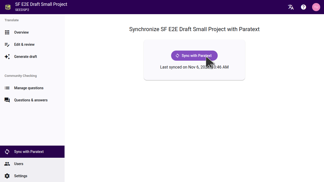 Synchronizing your Scripture Forge project with Paratext is very important, as this allows changes you have made in Scripture Forge to be saved to the Paratext servers and also pulls the latest data from your Paratext project into Scripture Forge.