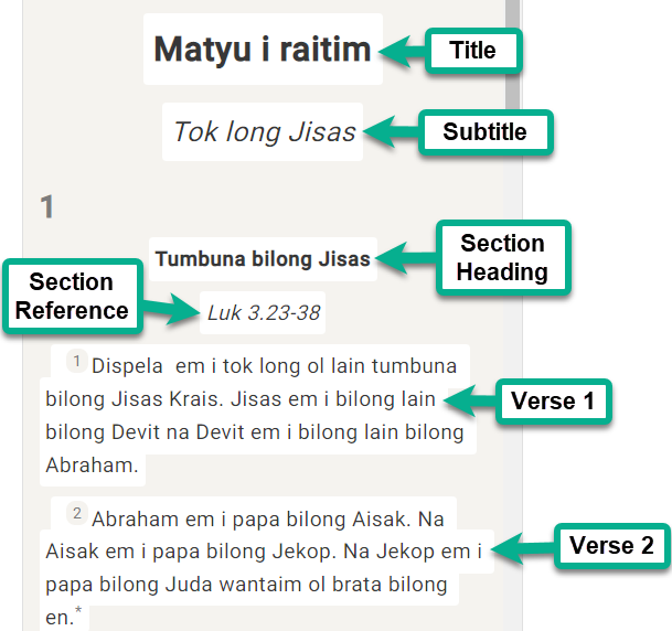 In Scripture Forge, a segment is a section of Scripture to be translated. This can be a section heading, a verse, or a part of a verse (like in poetry).