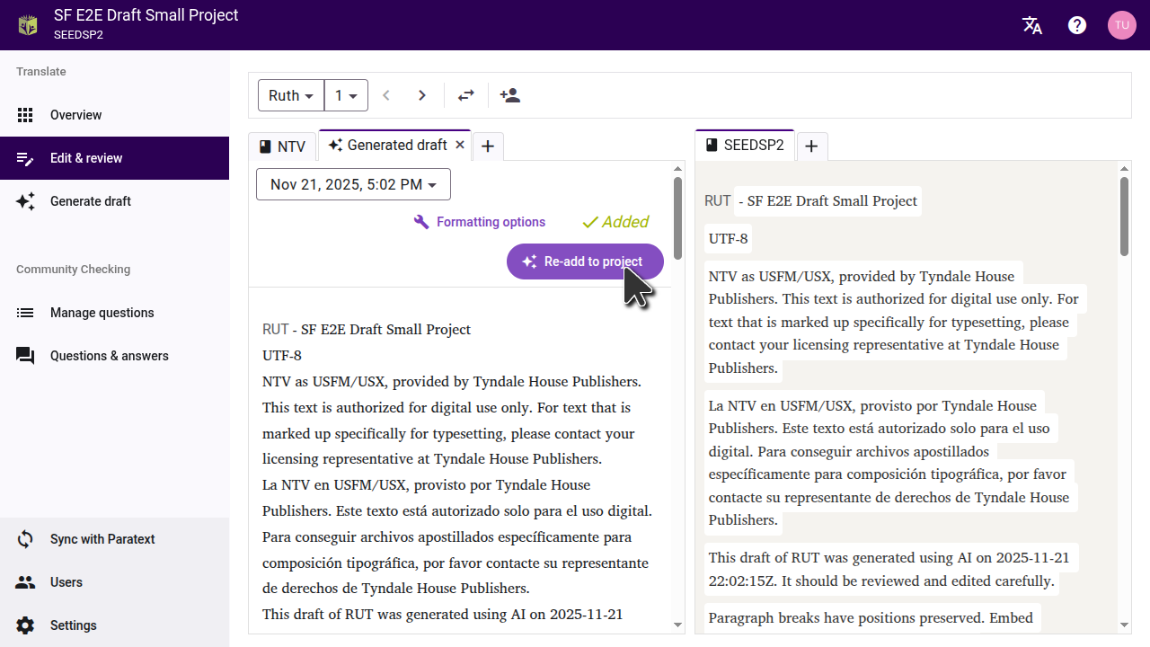If you prefer not to import the draft directly to your project, you can also download the draft as USFM files. On the "Generate draft" page, click "Download draft", and extract the files on your computer. You can then import these files into a project in Paratext.