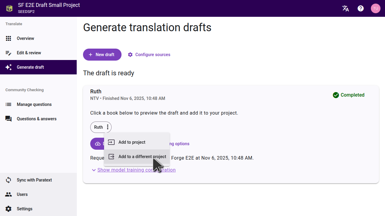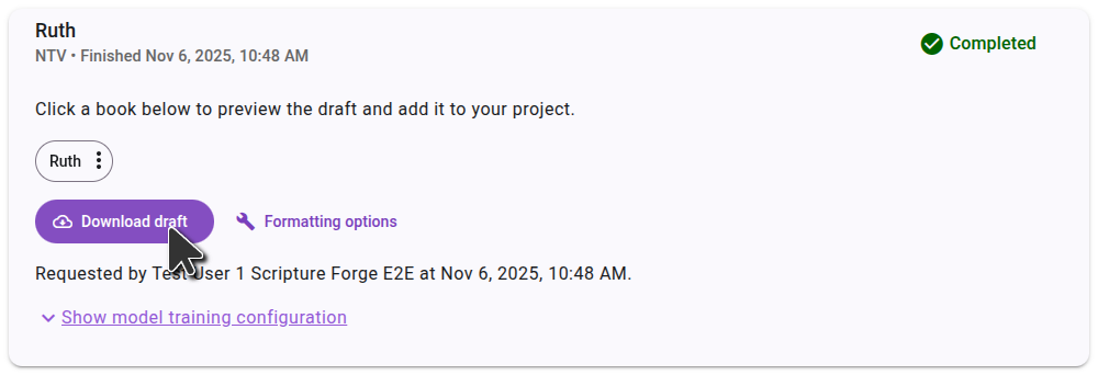 When your draft is finished, Scripture Forge will indicate that it's ready and list the books that were drafted. Generated drafts are not automatically imported to your project. You can preview or import drafts from the Generate draft page.