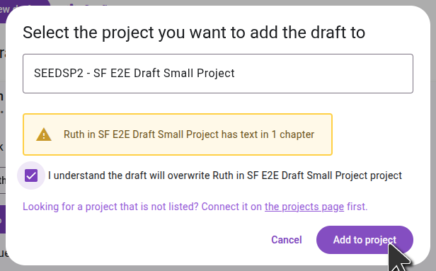 In the dialog that opens, select the project you want the draft to be imported to. If the project hasn't been connected in Scripture Forge yet, you will need to connect it first. Important: Importing the draft will replace any existing content in the project for that book.
